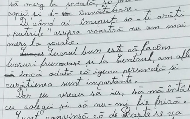 0O fetiţă din Iaşi, instituţionalizată într-un centru de plasament, a scris o scrisoare „adresată” bolii Covid-19, pe care o roagă să plece, pentru că îi e dor de colegi şi de şcoală.