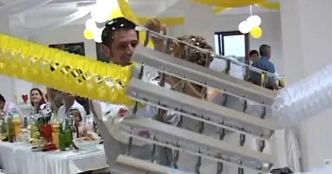 Mirii din videoclipul de mai sus dansau îmbrăţişaţi când unul dintre nuntaşi sparge un balon plin cu confeti. Din nefericire pentru cei doi îndrăgostiţi, nu le-au căzut în cap doar bucăţile de confeti ci şi grilajul de lumini de care balonul era prins. Nimeni nu a fost rănit, iar faza a stârnit hohote de râs din partea nuntaşilor.