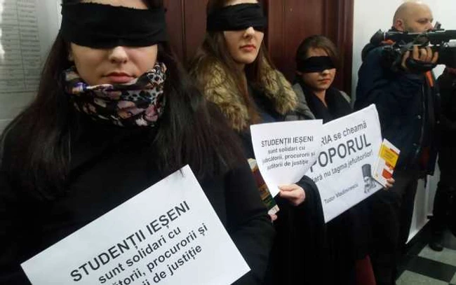 La protestul de pe holurile Facultăţii de Drept din Iaşi au luat parte zeci de studenţi. Au venit cu volume de specialitate printre care şi Condul Penal şi cu mesaje precum: „Nu vrem republică infracţională“ sau „Stundeţii ieşeni sunt solidari cu judecătorii“. Au purtat banderole negre pe ochi şi la gură.