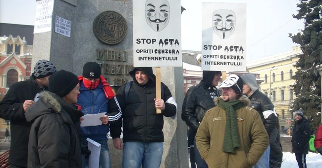 0Protestatari de toate vârstele s-au strâns la prânz, în Piața Unirii, ca să-și strige nemulțumirea față de Anti-Counterfeiting Trade Agreement (ACTA), tratat pe care România l-a semnat, alături de alte 22 de țări. Cei 100 de manifestanți au strigat sloganuri împotriva ACTA, susținând că îngrădește libertatea de exprimare.