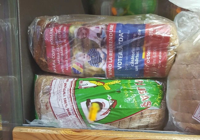 Pâinea „pro-referendum” este în mai toate ABC-urile orădene, dar şi în magazinele mai mari, respectiv hypermarketurile din oraş, aşezate cu grijă cu pliantele în jos, în aşa fel încât acestea să fie vizibile doar dacă sunt întoarse.