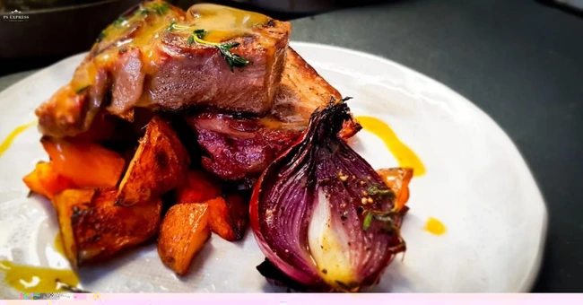 „Cartofii, lăsaţi în coajă, se opăresc, apoi se taie felii şi se pun la cuptor cu unt, rozmarin, vin, usturoi, iar după 10 minute adaug dovleacul opărit şi tăiat cubuleţe. În farfurie, textura dovleacului copt va fi ceva mai moale decât a cartofului. În aceeaşi tavă pun o ceapă roşie, tăiată în două, stropită cu vin, sare, piper, unt, usturoi, cimbrişor, pe care o caramelizez la cuptor”, prezintă specialistul culinar modul de pregătire a preparatului.
