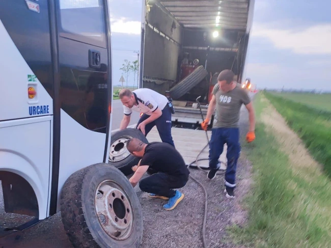 Doi poliţişti au ajutat un autocar cu copii căruia îi explodase un pneu pe E85. Șefii sunt mândri: „Felicitări, băieţi!“