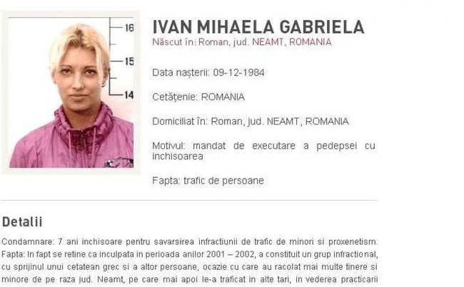 Mihaela Gabriela Ivan, în vârstă de 39 de ani, din municipiul Roman (Neamț), nu va executa pedeapsa aplicată pentru comiterea infracţiunilor de trafic de persoane şi proxenetism, fiind condamnată în urmă cu mult timp la 7 ani de închisoare. A fost mai bine de douăzeci de ani cu poliţia pe urmele ei, bănuindu-se că s-ar fi aciuat undeva prin Grecia.