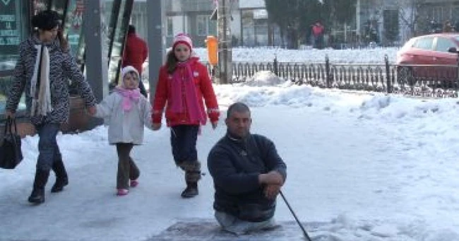 Petre Poenaru curăţă trotuarele din centrul oraşului, iar singura remuneraţie sunt banii întinşi de trecători. „ Nu îmi este ruşine să muncesc. Nu m-a angajat nimeni pentru asta, dar trec oameni care îmi mai întind un leu. Aşa câştig nişte bani şi mă încălzesc şi eu pe gerul de afară", povesteşte Petre Poenaru.