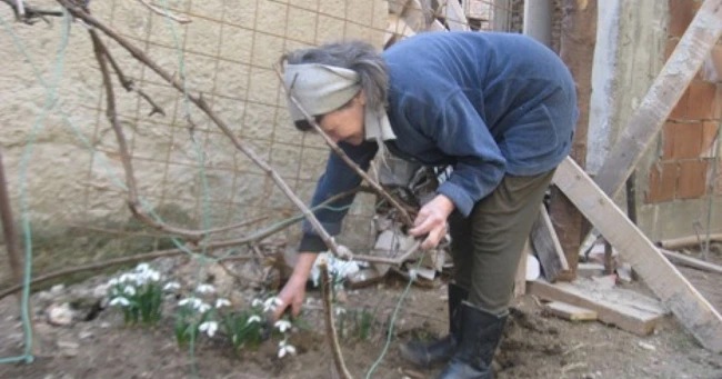 „Mi-au ieșit ghioceii și vreau să pun cerceluși, panseluțe și albăstrele. Cum le cumpăr, cum le pun. Mai aștept însă o ploaie, că vremea e încă rece", spune femeia în timp ce lucrează cu o săpăligă improvizată la gardul viu de pe margine aleii.