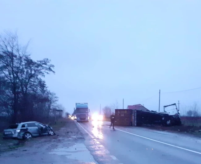 Un TIR s-a răsturnat după coliziunea cu o maşină. Continuă seria nenorocirilor pe E85, în Neamţ