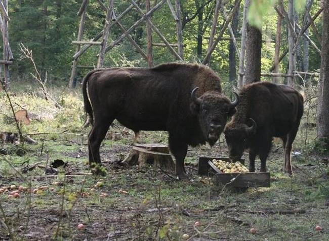 VIDEO Zimbrii liberi, ademeniţi cu mere în pădure. La ce foloseşte strategia specialiştilor din Parcul Natural Vânători