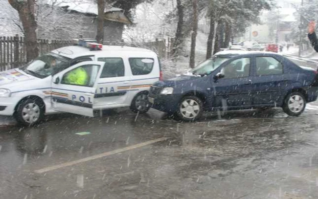 Prima zăpadă care a căzut ieri în Argeș le-a dat bătăi de cap șoferilor. O șoferiță de 41 de ani din Pitești a reușit ieri să facă accident în apropierea Spitalului Județean și să lovească... chiar mașina Poliției.