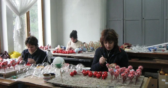 De la atelierul de suflătorie, sferele din sticlă merg la decorat. Aici, într-o cameră de maximum 30 de metri pătraţi, plină cu recipiente în care se află culori, sclipici şi pensule, mai multe femei pictează globurile. Este o adevărată magie. Zeci de culori vii puse pe masă aşteaptă să fie luate cu pensula şi întinse pe sticlă.