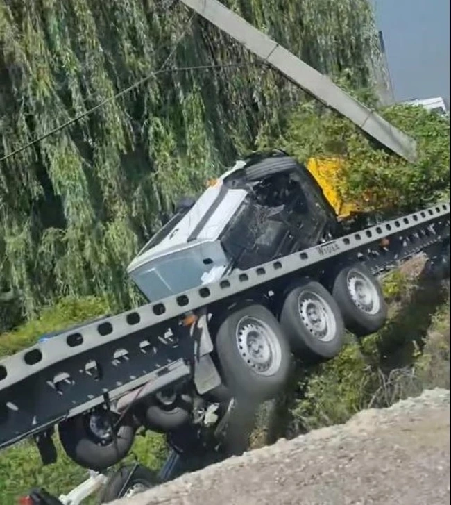 Este vorba despre o autoutilitară care a căzut de pe platforma remorcată de un autotren. În cădere, aceasta a lovit un branşament de gaze şi doi stâlpi, unul de electricitate şi unul de telecomunicaţii.