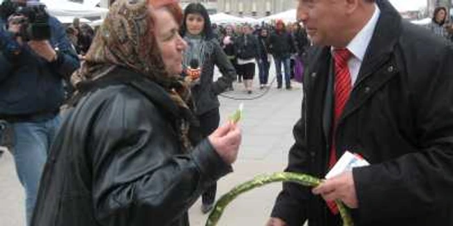Tudor Pendiuc a ieşit în întâmpinarea domnelor şi domnişoarelor cu un coş cu mărţişoare. Le-a felicitat de 1 martie şi le-a urat de bine.