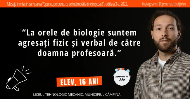„La orele de biologie suntem agresaţi fizic şi verbal de către doamna profesoară”, elev în vârstă de 16 ani, Liceul Tehnologic Mecanic, Municipiul Câmpina.