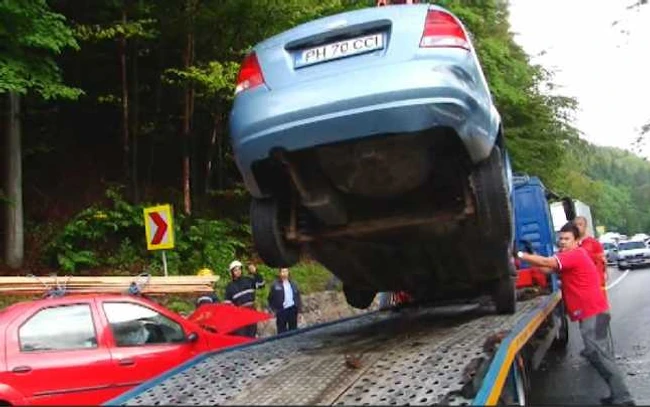 Autoturismele avariate în urma accidentului au fost urcate pe o platformă FOTO Diana Frîncu
