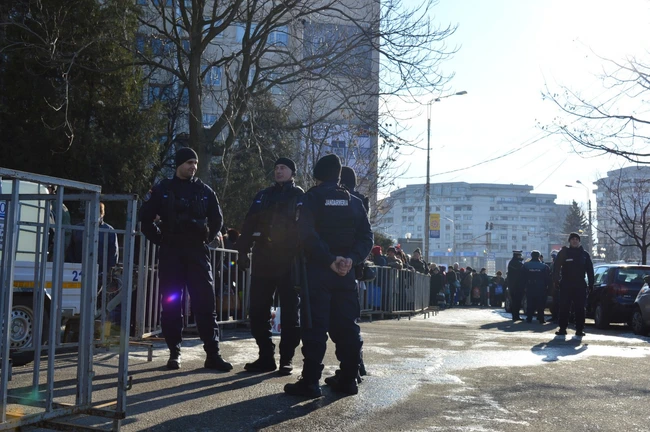 Cozile de enoriaşi dotaţi cu bidoane de plastic s-au întins pe zeci de metri, însă jandarmii şi gardurile metalice montate în zonă au făcut ca distribuţia apei sfinţite să se desfăşoare fără incidente.