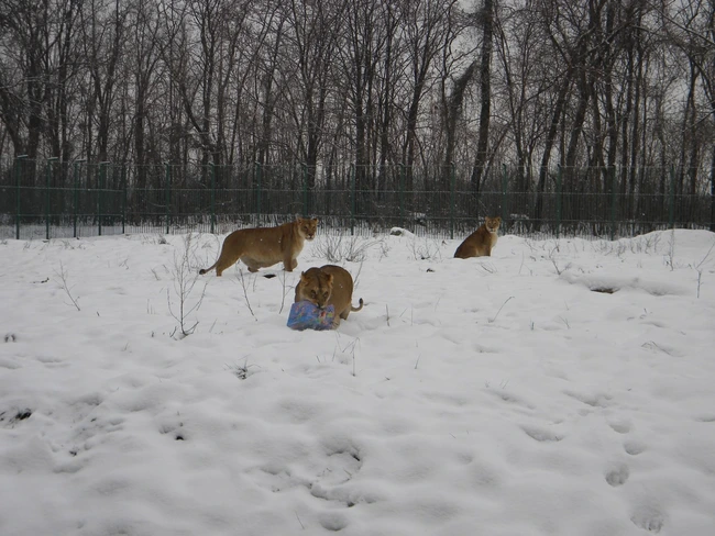 Pe lista celor care au primit cadouri au fost şi cei trei lei de la Zoo. Fără delicateţuri, aceştia au înhăţat cadourile cu gesturi de felină, şi, după ce s-au jucat puţin cu cutiile, le-au sfâşiat pentru a ajunge la conţinut.