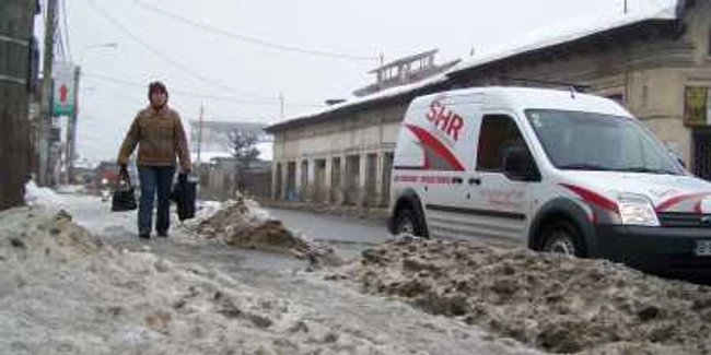 Trotuarele sunt acoperite fie de zăpadă, fie de apă, pietonii încercând să facă slalom printre ele, pentru a nu-şi uda încălţămintea.