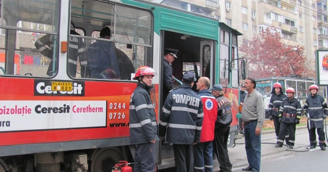 Ploieşti: Un tramvai plin cu pasageri a luat foc pe Bulevardul Republicii FOTO