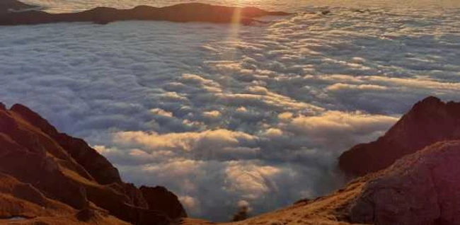 Imaginile sunt spectaculoase, crestele munţilor care răsar din marea de nori sunt aurii de-a dreptul, iar lumina devine orbitoare.