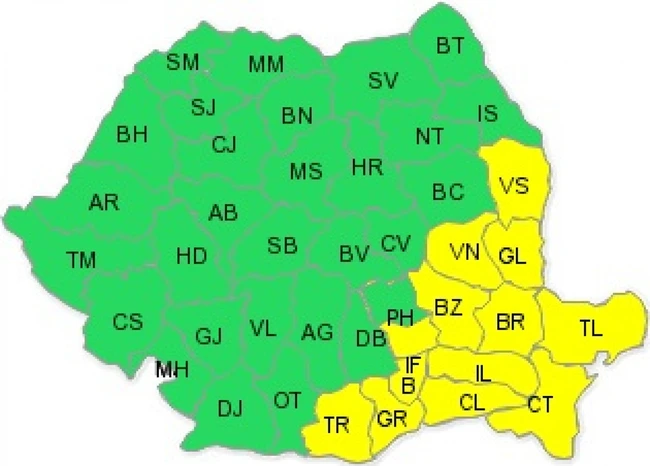 0Administraţia Naţională de Meteorologie a emis o atenţionare de cod galben, valabilă în sudul şi sud-estul ţării, de intensificări ale vântului şi ninsori