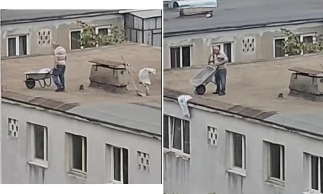 În imaginile filmate, muncitorul se apropie de marginea clădirii și răstoarnă o roabă plină de moloz. Alături de el se mai afla un bărbat.