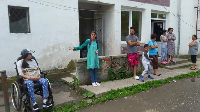 În curtea blocului întâlnim şi o fată slabă, într-un scaun cu rotile. Are un handicap locomotor şi, deşi nu pare mai mare de 15 ani, mărturiseşte că are 21. Mama ei se chinuie să o urce şi să o coboare pe scări şi o duce de câte ori poate la o clinică de recuperare. Mai are o fetiţă mai mică şi toate locuiesc la etajul al doilea, în căminul groazei. Mama mai spune că îşi doreşte un singur lucru, ca reprezentanţii Primăriei să renoveze camerele de la parter şi să le lase să locuiască acolo, pentru că astfel nu ar mai fi nevoită să-şi urce fiica două etaje, cu tot cu cărucior.