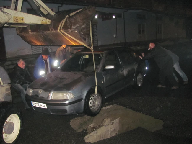 Maşina a fost scoasă, iar la locul incidentului au venit poliţişti, prefectul judeţului şi muncitori de la societatea de distribuire a apei. Ipoteza care s-a lansat a fost aceea că asfaltul a cedat în dreptul unor conducte de apă. Un utilaj a început decopertările pentru a se vedea cât de mare este craterul, care la prima vedere avea diametru de trei metri şi o adâncime considerabilă de mai bine de un metru.