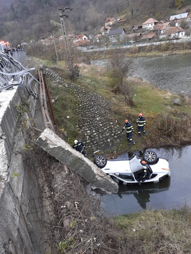Autoturismul a căzut în apă de la cel puțin cinci metri înălțime. Din imaginile transmise de ISU Vâlcea (VEZI VIDEO) reiese că impactul a fost destul de violent, pentru că autoturismul a distrus, înainte de a cădea în apă, parapetul de protecție din metal de pe marginea șoselei și a angrenat în cădere și un bloc de beton în care era prins acesta.