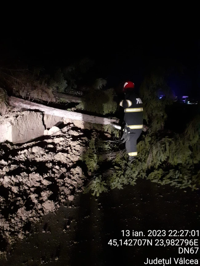 Sursa citată a mai precizat că la fața locului se acționează pentru înlăturarea copacilor care blochează drumul, inclusiv cu ajutorul unei echipe din partea ISU, dar și că traficul pe drumul care face legătura între Horezu și Târgu Jiu a fost deviat, circulația fiind dirijată de către echipaje de poliție printr-o parcare paralelă cu zona distrusă de alunecare.