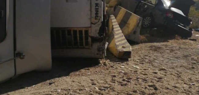 FOTO DN 7, scena unui nou accident rutier. Trei oameni au fost răniţi după ce un TIR s-a răsturnat peste un autoturism