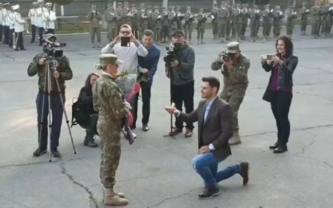FOTO VIDEO Femeie militar cerută de soţie în faţa a zeci de colege convocate să depună jurământul. Cum a reacţionat tânăra