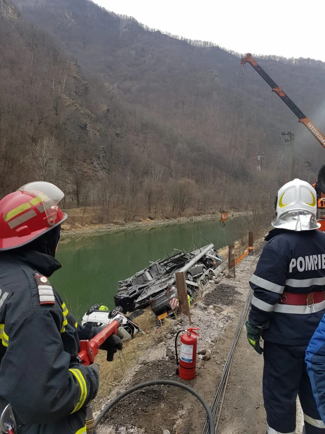 Video FOTO VIDEO Imagini spectaculoase de la operaţiunea de scoatere a TIR-ului cu maşini căzut în râul Olt. Trafic blocat timp de două ore pe Valea Oltului