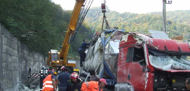 Azi, în jurul 12,40 un tir condus de un şofer turc care circula dinspre Piteşti către Râmnicu Vâlcea a derapat într-o curbă periculoasă din localitatea Milcoiu, la km. 160, pe Dealul Negru şi s-a răsturnat pe sensul opus de circulaţia. Cauza accidentului a fost neadaptarea vitezei de deplasare într-o curbă periculoasă la dreapta, semnalizată corspunzător. Potrivit primelor date ale Poliţiei Rutiere, doi pasageri dintr-un Volkswagen Cady, cu număr de Bucureşti, au fost răniţi, la fel şi şoferul turc. La ora 15.10, surse din Poliţia Vâlcea ne-au spus: „În acest moment se circulă pe ambele sensuri, tirul răsturant ocupând doar unul dintre sensurile duble, la urcare". Poliţia face eforturi pentru a aduce o macara de mare capacitate ca să ridice mastodontul din carosabil.