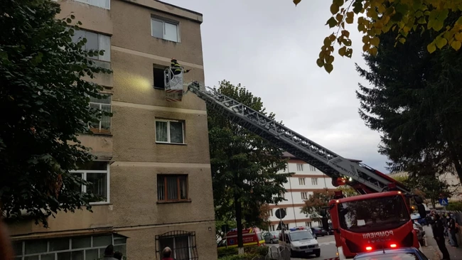 Pompierii militari din cadrul ISU Vâlcea au fost nevoiţi să intervină cu o autoplatformă pentru înălţime, într-un apartament aflat la etajul trei.
