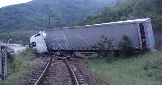0Tir rasturnat pe calea ferata (Foto arhiva)