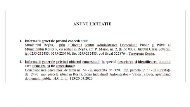 Anunţ licitaţie organizată de primăria municipiului Reşiţa