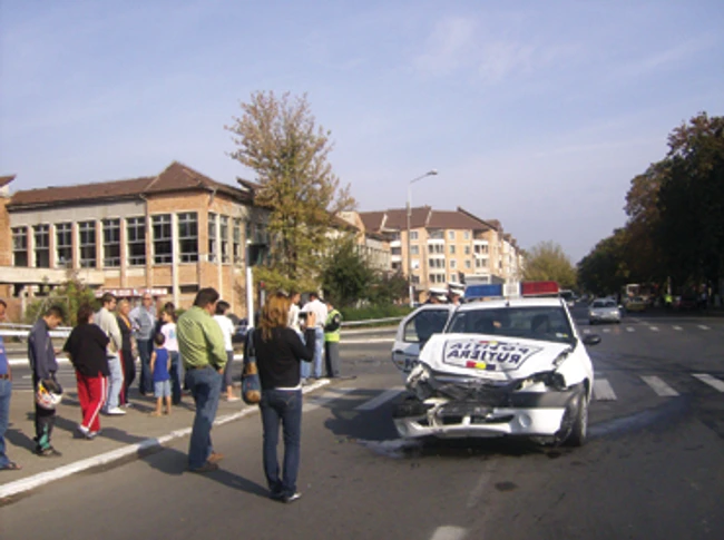 Din cauza ignorării alarmei sonore şi luminoase, conducătoarea unui Fiat Stylo a tăiat calea unei maşini de poliţie aflată în misiune pe străzile din Hunedora. Ca urmare a impactului, Fiat-ul s-a dat peste cap oprindu-se pe capotă. Pasagerii lui, o mamă şi fiica sa, au suferit leziuni uşoare şi au fost internate la spital. Ada Ionescu