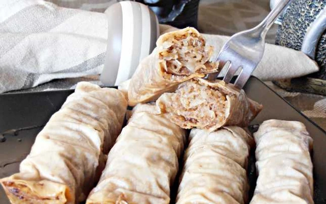 Presaţi aceste sărmăluţe de la capete, ca să aibe un aspect încreţit şi aşezaţi-le într-o tavă unsă cu unt.Apoi ştiţi dumneavoastră, la cuptor, o jumătate de ceas la 190 de grade Celsius. Trebuie să iasă din cuptor rumene şi cu iaşmac turcesc, adică să semene cu rugina apusului de soare în Bosfor.