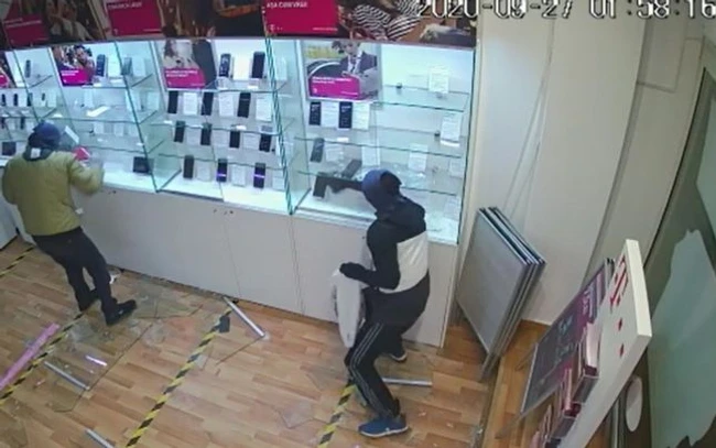 Cei doi acţionează rudimentar. Iau, una câte una, telefoanele mobile expuse şi le aruncă în pungi de nylon, dar nu par intimidaţi de alarma care a pornit între timp. Din imagini se vede că este vorba de persoane tinere, cu feţele acoperite şi mănuşi.