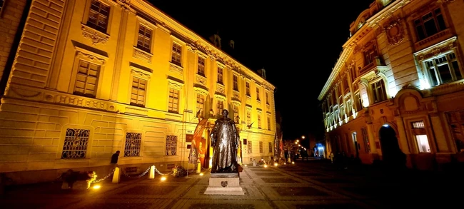 Statuia lui Brukenthal din Sibiu, pângărită. Vandalizatorul, surprins pe camerele de luat vederi