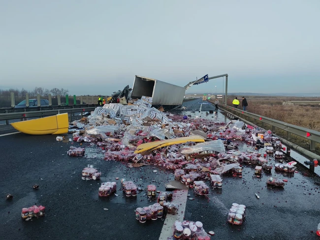 Ansamblul implicat în acest accident mortal pe A1 se îndrepta spre Nădlac, când s-a produs tragedia. Era încărcat cu mii de borcane cu compot, care s-au răsturnat pe șosea în urma impactului.