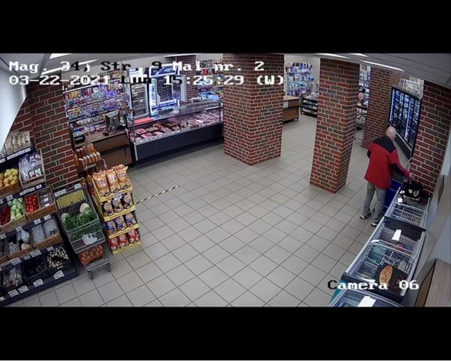 Imaginile îl surprind pe acesta cu o pungă într-o mână şi cu verdeţuri în cealaltă mână plimbându-se pe la vitrina cu servire asistată şi apoi pe la vitrinele frigorifice. Pe una dintre acestea observă o poşetă. Profitând de faptul că proprietara nu este prin apropiere, şi nici angajaţii nu se văd, magazinul nu prea are clienţi şi nu este nimeni prin preajmă care l-ar putea da de gol, bărbatul deschide rapid geanta şi sustrage un pachet, apoi se îndepărtează din zonă ca şi cum nimic nu s-ar fi întâmplat. Următoarele imagini îl arată tot la vitrina cu servire asistată, unde nu mai pare să aibă asupra lui punga, dar o altă pungă sau aceeaşi se vede într-un coş de lângă poşeta prădată.