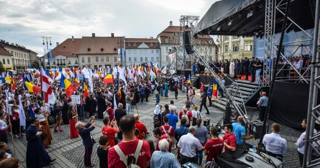 Mii de persoane, în principal tineri, s-au adunat în centrul oraşului Sibiu în după-amiaza zilei de joi, 6 septembrie, ca să-l vadă pe patriarhul Bisericii Ortodoxe Române, să asculte o slujbă, după care să urmărească un program artistic.