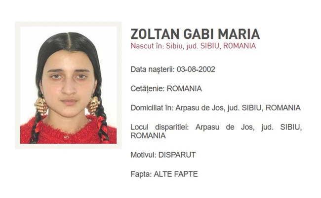 „În cauză (dispariție Sibiu - n.red.), la nivelul Serviciului de Investigații Criminale Sibiu, s-a deschis un dosar de cercetare penală sub aspectul săvârșirii infracțiunii de lipsire de libertate în mod ilegal, polițiștii sibieni desfășurând în prezent activități specifice în vederea depistării tinerei”, menționau joi polițiștii sibieni cerând ajutorul populației pentru găsirea fetei.