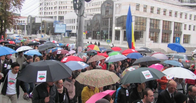 UPDATE 21:30 Aproximativ 400 de protestatari au luat parte la marşul de la Sibiu. Cu toţii s-au conformat şi au venit echipaţi cu umbrele, pe care le-au ţinut deschise pe toată durata protestului. Coloana de protestatari s-a deplasat pe traseul strada Nicolae Bălcescu - Calea Dumbrăvii - bulevardul Mihai Viteazul şi retur, manidfestanţii scandând lozinci precum ”Uniţi salvăm Roşia Montană”, ”Nu corporaţia face legislaţia”, Refuz, rezist gazelor de şist”, ”Veniţi cu toţii şi strigaţi tare că România nu e de vânzare”, Trădarea de ţară în aur se măsoară”, ”Guvernul să ştie, România e vie”, ”Roşia, Roşia, vine revoluţia”, ”S-a dat şpagă barosană pentru roşia Montană”.
