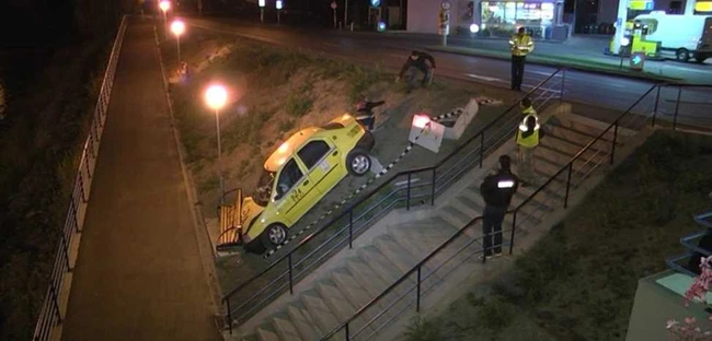 Un taxi a ajuns în această seară pe malul Cibinului, în zona noului pod inaugurat de curând de autorități.