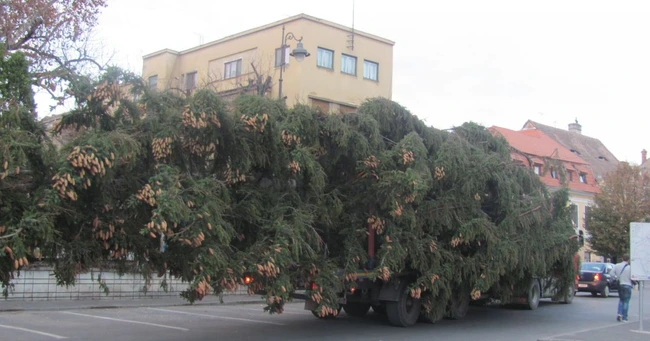 VIDEO FOTO Bradul de Crăciun a ajuns în centrul Sibiului. Are 22 de metri înălţime şi 90 de ani