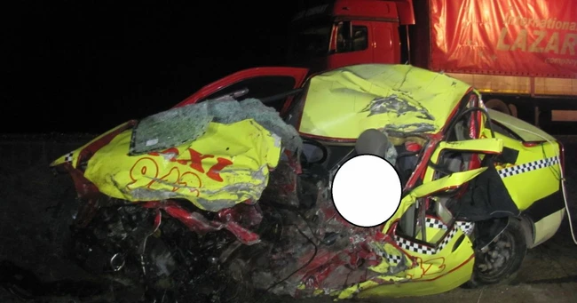 0Accident cumplit în noaptea de miercuri spre joi pe drumul naţional 1, în judeţul Sibiu. Un tânăr taximetrist şi-a pierdut viaţa, după ce maşina pe care o conducea s-a izbit violent de un TIR.
