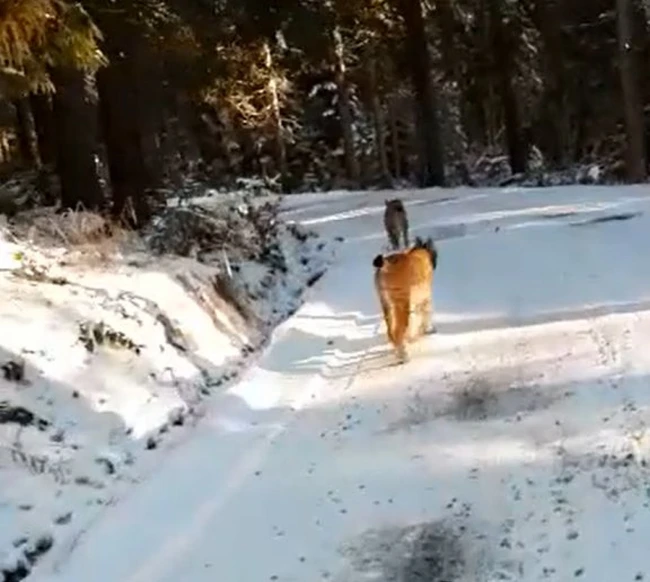 Bărbatul aflat la volan a profitat şi a filmat felinele cu camere de la bord. Astfel de cazuri sunt foarte rare, întrucât râşii sunt animale timide care fug din calea omului şi sunt foarte greu de filmat. În plus, râşi sunt animalele solitare şi foarte rar sunt surprinse două exemplare împreună.