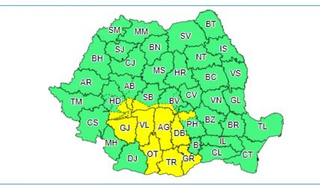 0Meteorologii au lansat o nouă avertizare Cod Galben, şapte judeţe fiind vizate în întregime, dar şi zone din alte patru.
